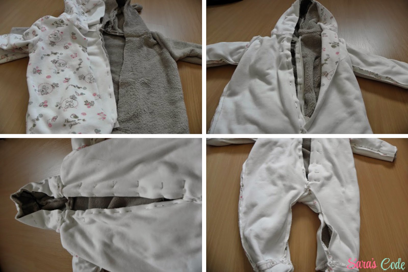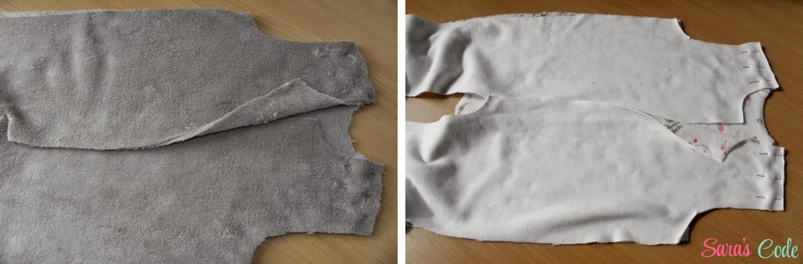 ? Una vez colocada y cosida la copa de la manga, enfrentamos las piezas de espalda y delantero derecho contra derecho para poder coser de la parte de la abertura de la manga derecha a la manga izquierda pasando por la entrepierna.