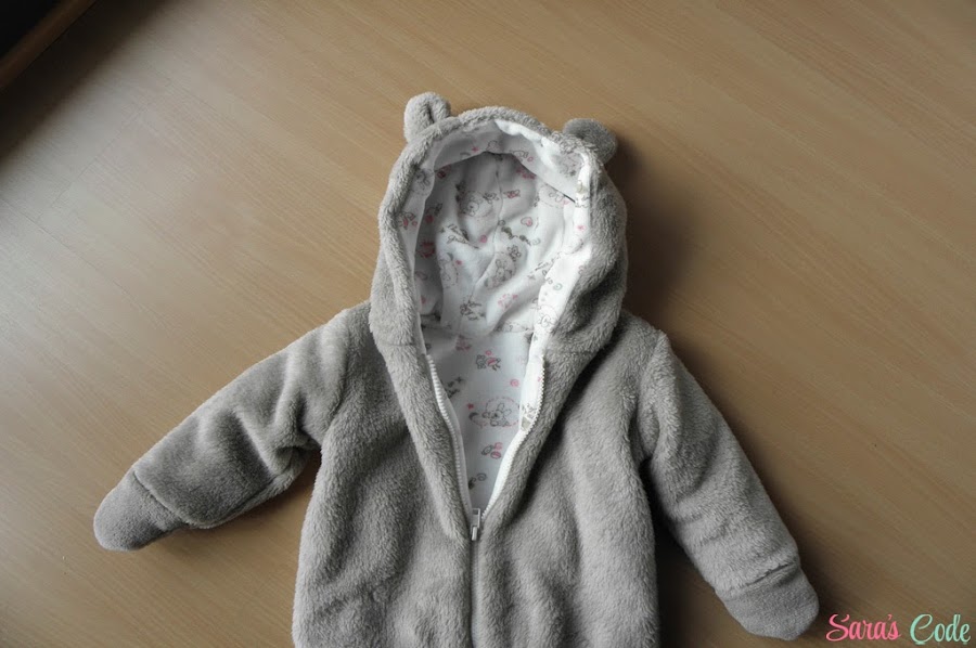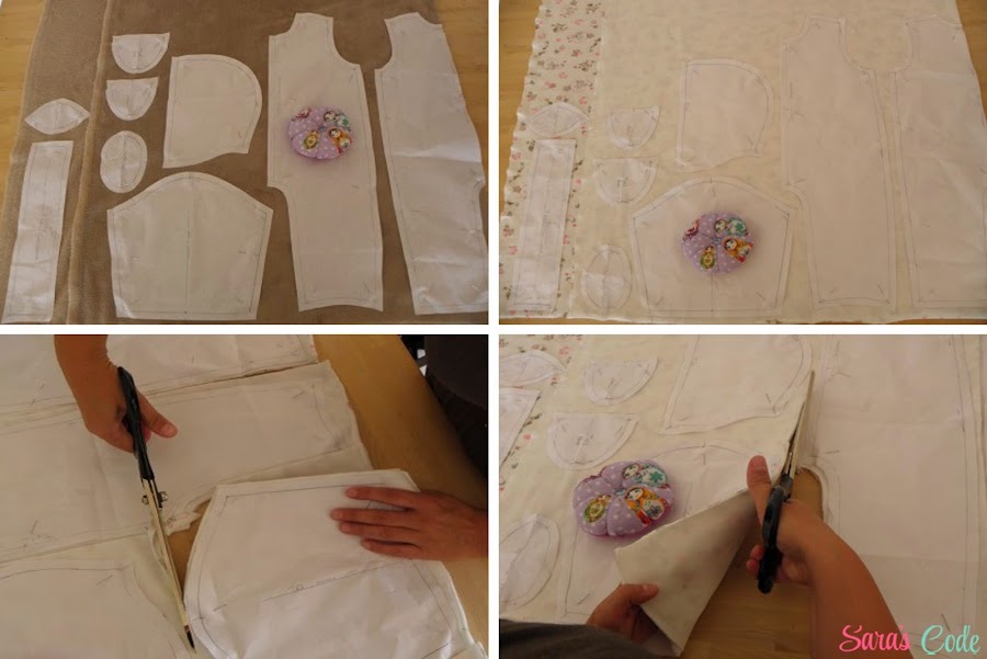 ? Doblamos la tela exterior derecho contra derecho, colocamos el patrón de espalda que lleva lomo para que salga entero, colocamos las demás piezas (delantero, capucha, pies, manos) todas estas piezas van cortadas dobles, menos la pieza central de la capucha y la vista de la cremallera.