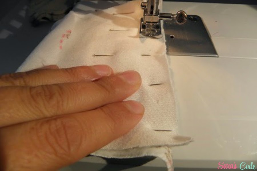 ? Colocamos encima la pieza central y las unimos derecho contra derecho, primero un lateral y luego otro.