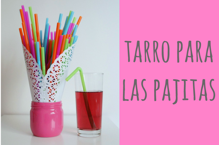 Necesitamos un bote de cristal, preferiblemente bajo, pintura en spray ( mejor de un color alegre, aunque esto va en gustos! ) una blonda de repostería y pajitas de colores.