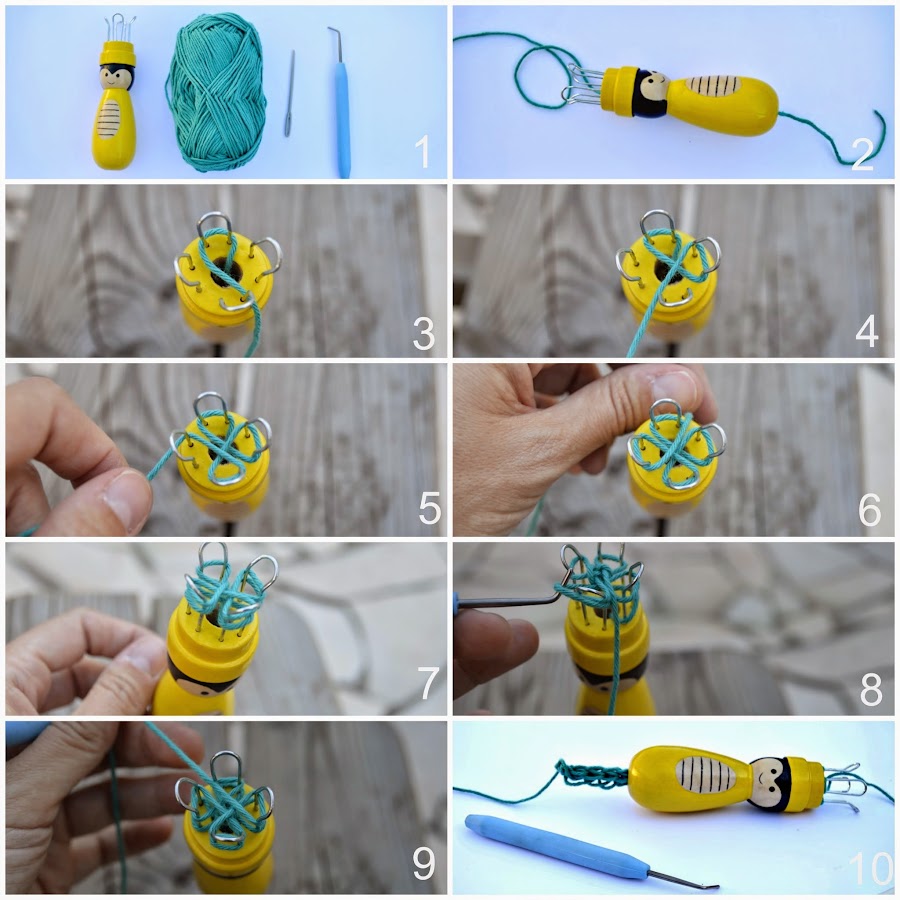 Con ayuda del gancho cogeremos la hebra que se encuentre más debajo de la punta del tricotín y la sacaremos pasando por encima de la otra hebra tal y como vemos en la foto 8.