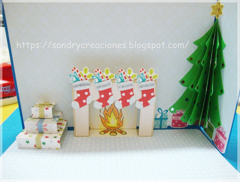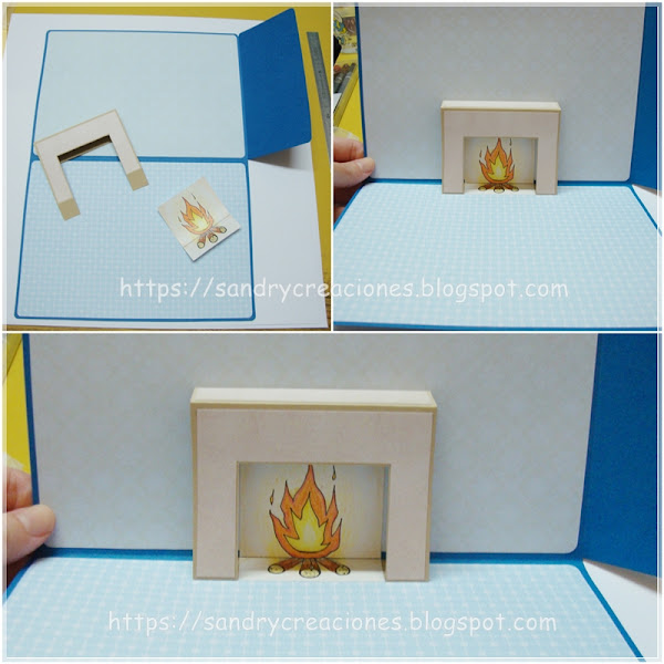 Esta vez hemos querido ir un poco más allá y hemos querido probar con un tipo de postal o tarjeta de scrap llamada pop up, llamada así porque al abrirla tiene elementos que se abren o quedan como quien dice en 3D o salidos de la postal. Buscando inspiración por la red nos gustaban mucho las que veíamos que tenían árboles y muy en especial las que tenían chimeneas con su fuego dando calor de hogar, así que decidimos hacer nuestra versión con estos elementos. En esta ocasión no os vamos a contar paso a paso como lo hemos hecho porque ha sido la primera experiencia con este tipo de postales, así que hemos ido un poco sobre la marcha.