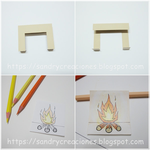 Para hacer el fuego pensamos en imprimir una imagen pero queríamos algo más nuestro así que decidimos dibujarlo y pintarlo a mano en un trozo de papel que después pegamos en el hueco de la chimenea.