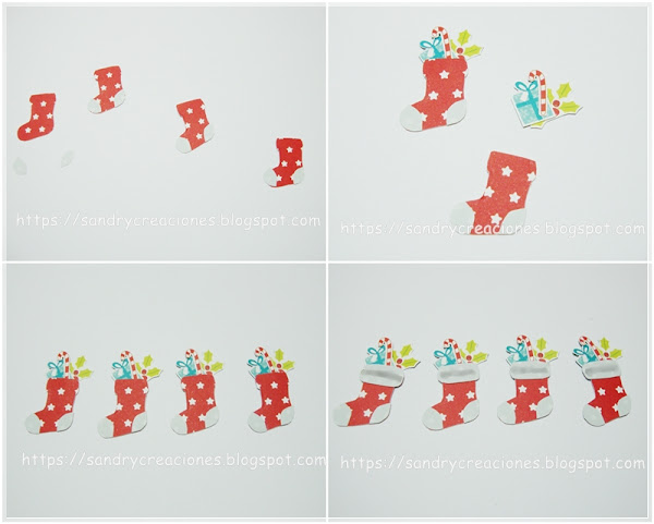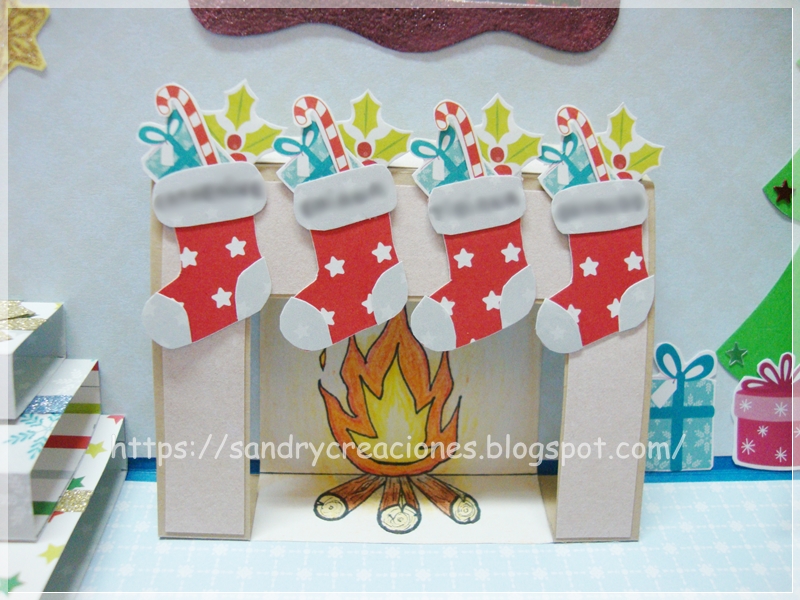 La idea de hacer una chimenea nos gustó por la posibilidad que nos daba de poner los típicos calcetines de Navidad o botas Navideñas colgados de ella, así que nos pusimos a confeccionar cuatro con diferentes papeles y elementos recortables de la colección "Feliz Navidad" de "Anita y su mundo".
