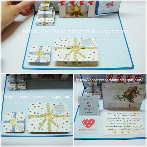 En este punto ya teníamos casi todo el interior de la tarjeta realizado, pero decimos casi porque nos faltaba poner algún mensaje más. La primera idea era escribirlo directamente en la parte del suelo de la postal pero no nos acababa de gustar así que en sintonía con la postal pensamos porque no poner algún elemento desplegable más? y nos decidimos por dos paquetes de regalos más, pero esta vez planos, realizados también con papel de scrapbooking de "Anita y su mundo", que se abrieran tipo libro o postal pequeñita. Por la parte interior los decoramos con otro tipo de papel de scrapbooking de "Toga" para embellecerlos y también con algún que otro detalle más hecho con sellos y tinta para poner unos lindos mensajes.