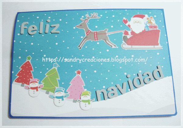 Ya solo nos quedaban las partes exteriores de la postal en las que decidimos recrear dos tipos de escenas navideñas muy típicas de estas fechas. En la parte delantera un paisaje nevado con sus árboles de Navidad y sus muñequitos de nieve que pusimos en relieve con la ayuda de cinta de doble cara con relieve. Todo bien colocado sobre un fondo de papel de scrapbooking azul con copitos de nieve, en el que pusimos a Papá Noel con su trineo. Y para finalizar pusimos el mensaje de "Feliz Navidad" con letras de goma eva adhesivas también de "Anita y su mundo".