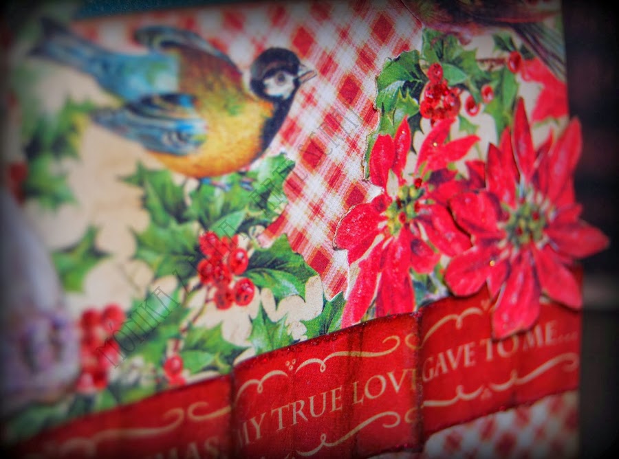 Entinté todos los contornos y bordes con Distress Ink color Walnut y le puse un par de flores de tela, un botón y unos trozos de cordón dorado.