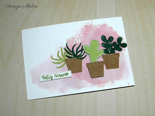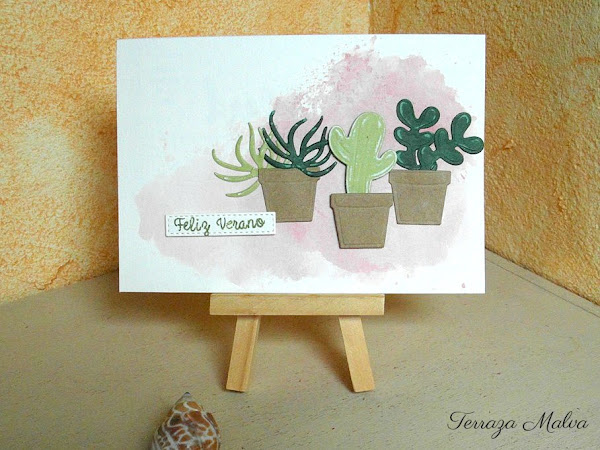 En la postal los elementos están sitados a diferentes alturas para dar sensación de profundidad. Además he utilizado almohadillas 3D tanto para el rótulo como en la maceta central. El troquelado del cactus es el que más me gusta....