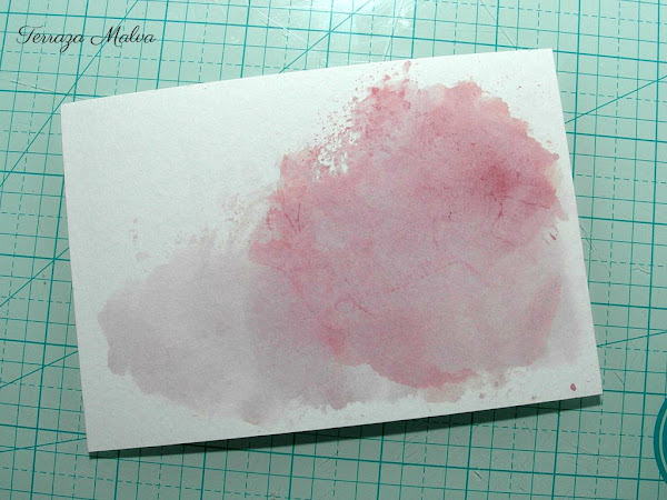 Como fondo para la postal he creado una zona acuarelada con tinta distress y la técnica de transferencia de tinta. Simplemente he estampado la almohadilla en un acetato que he rociado con agua y he transferido la tinta al papel de acuarela por contacto.