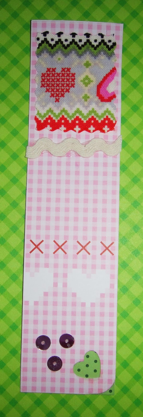 Tengo dos cosas en común con mi destinataria: a las dos nos gusta el punto de cruz y la lectura. Aprovechando que tenía un retal de tela con motivos imitando el punto de cruz, la utilicé como inspiración. Además hice un marcapáginas con los mismos motivos que la postal.