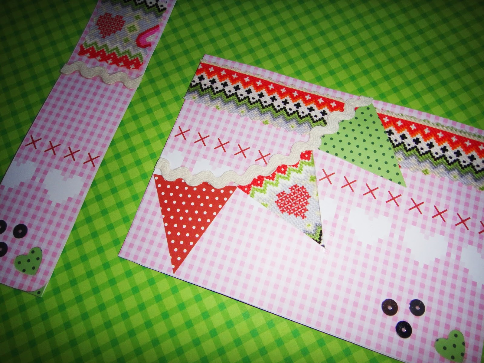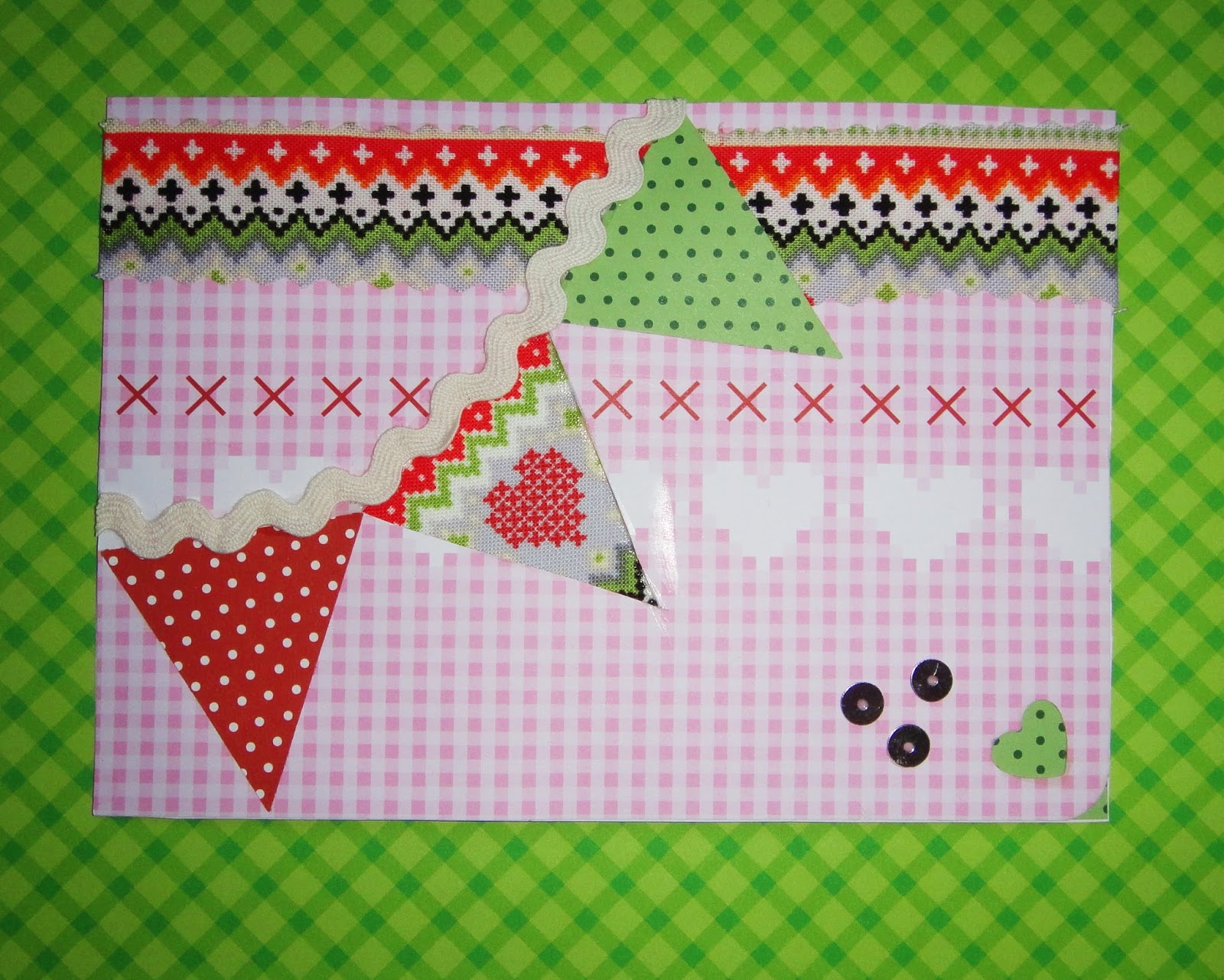 Combiné tela, papeles y piculina para hacer una guirnalda de triángulos sobre un fondo que también recuerda al punto de cruz. No podían faltar unas lentejuelas para darle un poco de brillo.