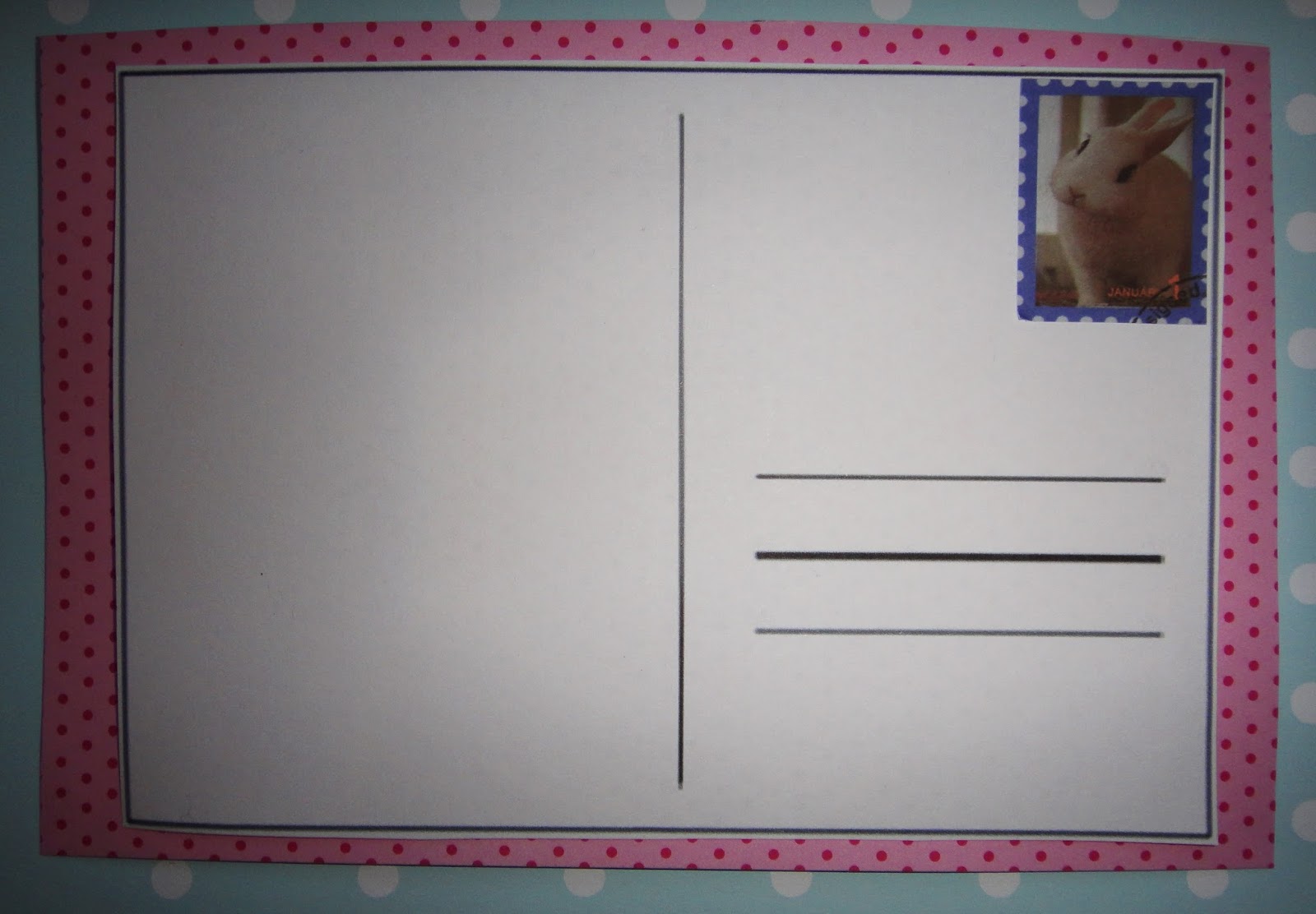 La trasera de la postal con el sello de conejito y el papel de lunares, me gusta como ha quedado, sencilla pero mona.
