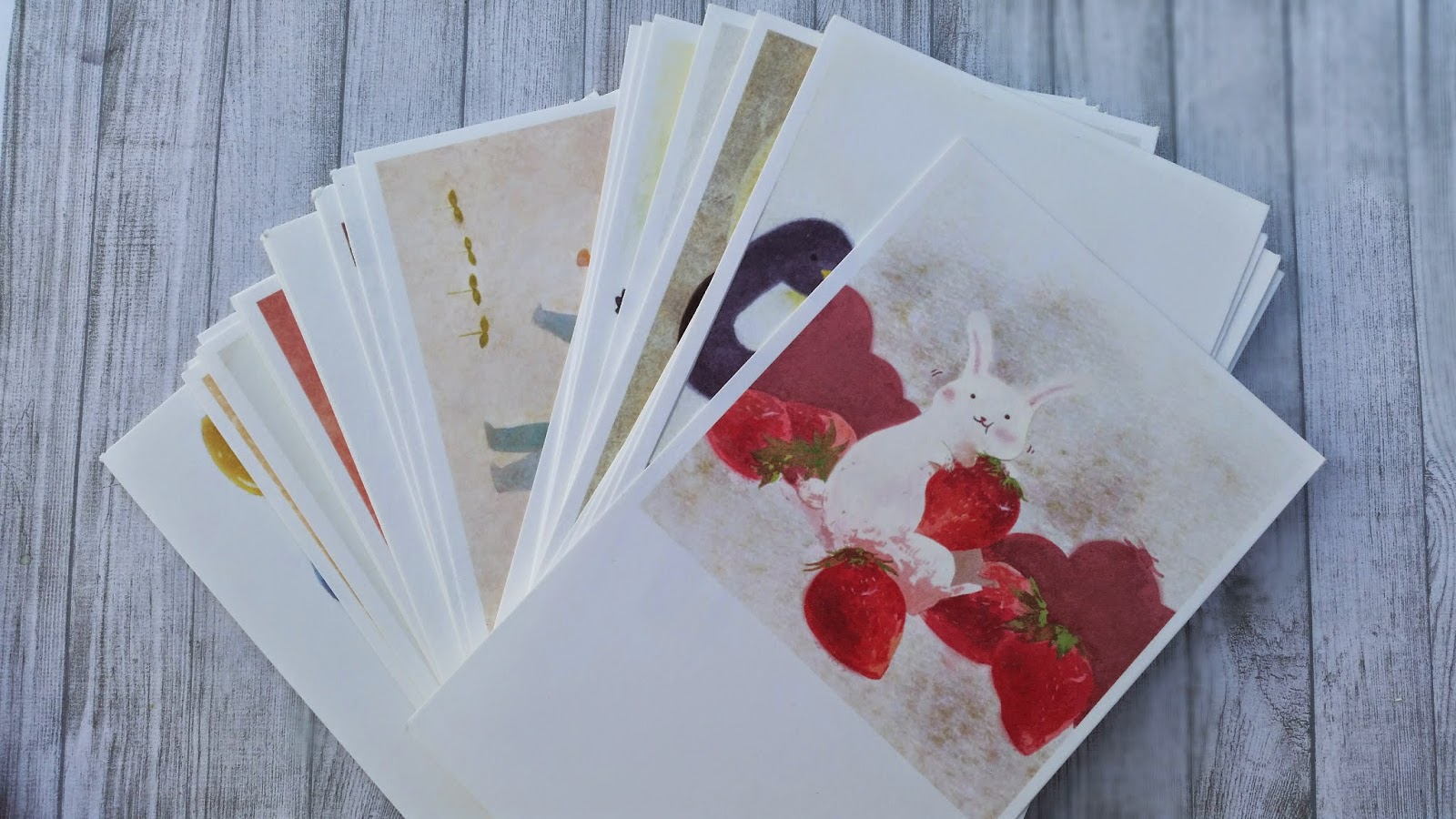 Están impresas en un papel grueso con acabado en mate. La única pega que les pongo es que los dibujos no completan el papel, parecen tipo polaroid. Podemos escribir algo en ese hueco que queda, aunque a mi gusto sería estropear la postal.