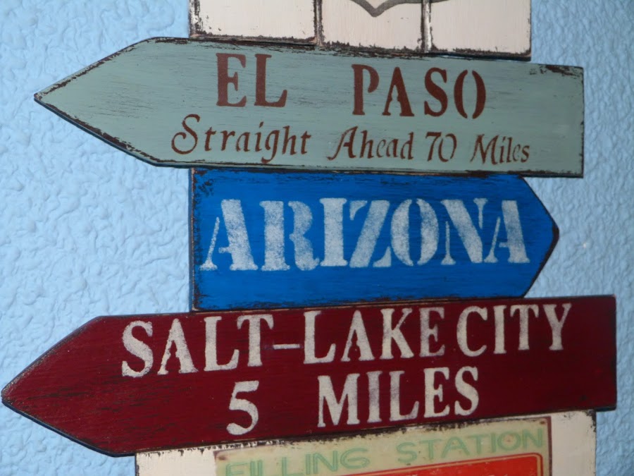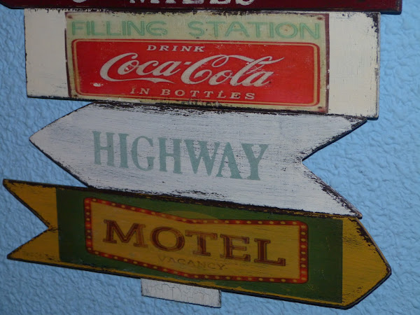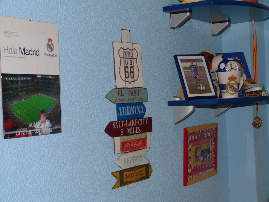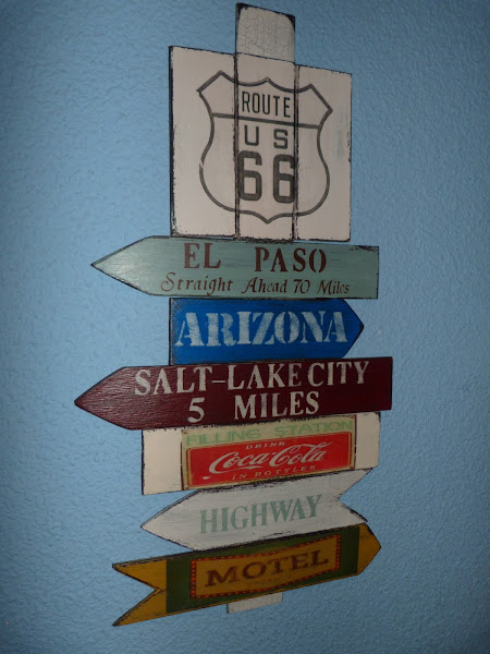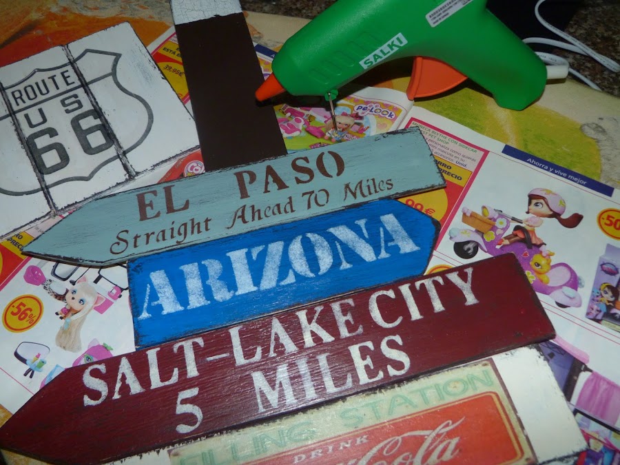Mi hijo me pidió que le hiciera un poste de carretera, de esos que se ven en las carreteras americanas de la ruta 66... bueno, tengo que decir que no me lo pidió de esta manera. Ojalá!!! Me dio una serie de explicaciones tan raras que yo no era capaz de entender lo que me estaba diciendoooo. Me tenía loca ya, hasta que por fin conseguí comprender lo que quería en realidad.