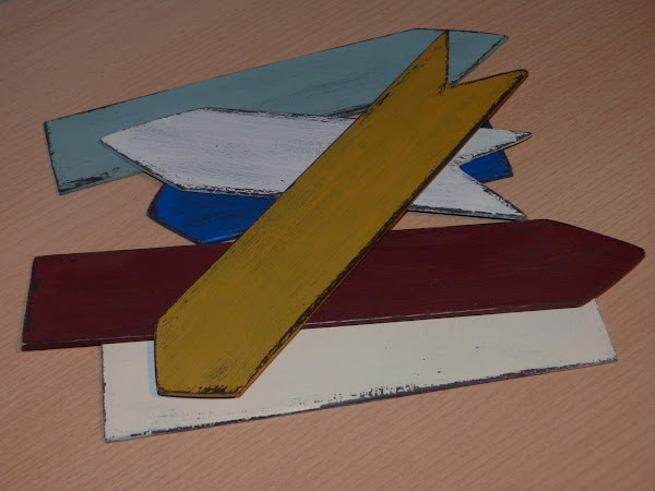 Para los demás carteles, tablas de distintas medidas, algunas de ellas cortadas en forma de flecha. Primero, pinté todas con una base oscura y pasé una vela por bordes y esquinas.