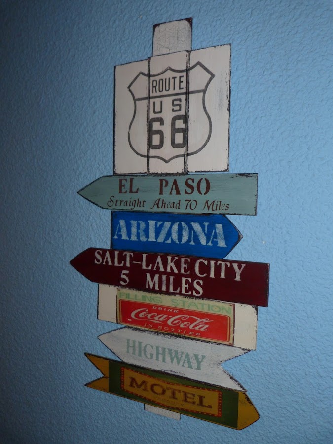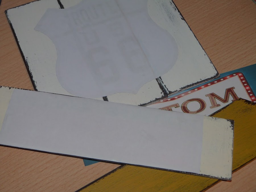 Una vez aclarado el asunto, el resto fue muy sencillo: mi hijo quería el escudo de la Ruta 66 arriba del todo, así que uní tres tablitas pequeñas para simular un cartel hecho de tablones.