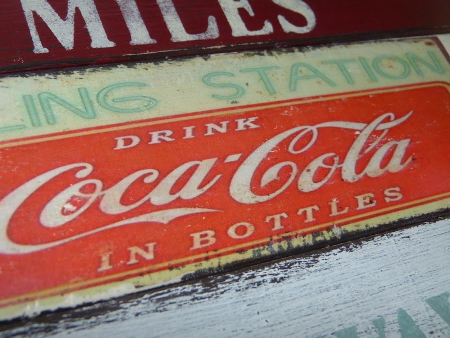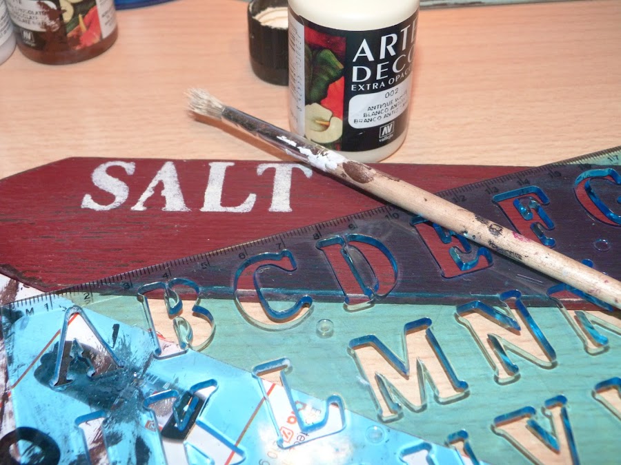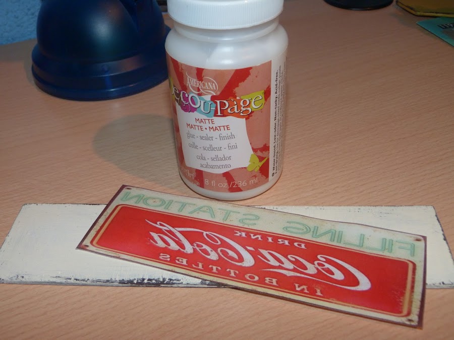 El escudo y dos de los carteles, los hice con transferencia de la imagen impresa en espejo y aplicada a la madera, ya pintada y desgastada, con gel para transfer. Si no tengo, como me pasó en esta ocasión, utilizo gel de decoupage normal sobre la imagen, y cola blanca sobre la madera. Después, pasado un tiempo, ya sabéis, despacito y con paciencia vamos humedeciendo el papel y retirándolo, bien con los dedos, o bien con una esponjita suave.
