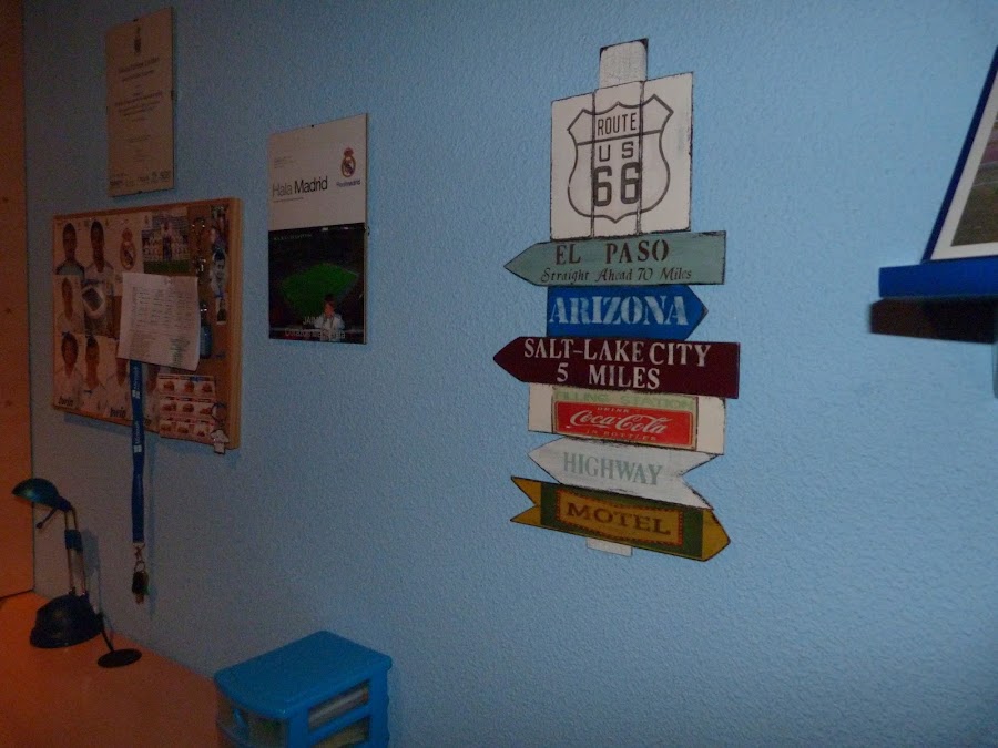En fin, que quería un poste de carretera con varios carteles. Su habitación es muy, muy, muy pequeña. Impensable plantar un poste en ningún sitio, así que la alternativa era hacerlo de pared.