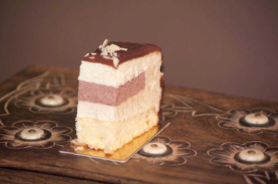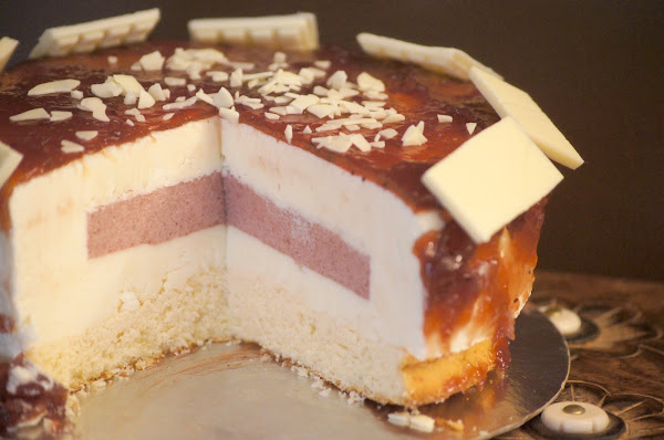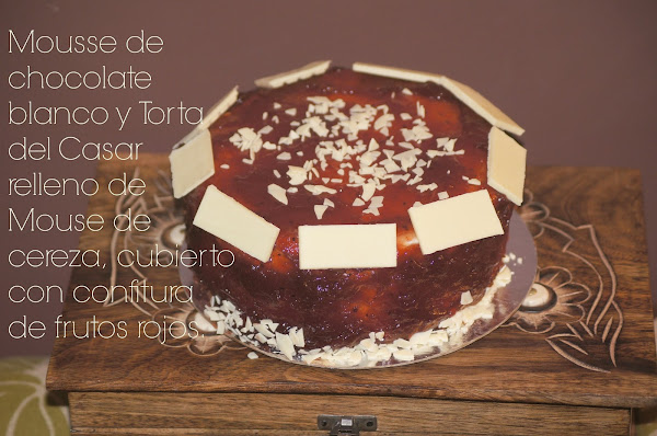 Vamos a preparar un: Mousse de chocolate blanco y Torta del Casar, relleno de Mouse de cereza, cubierto con una capa de confitura de frutos rojos.