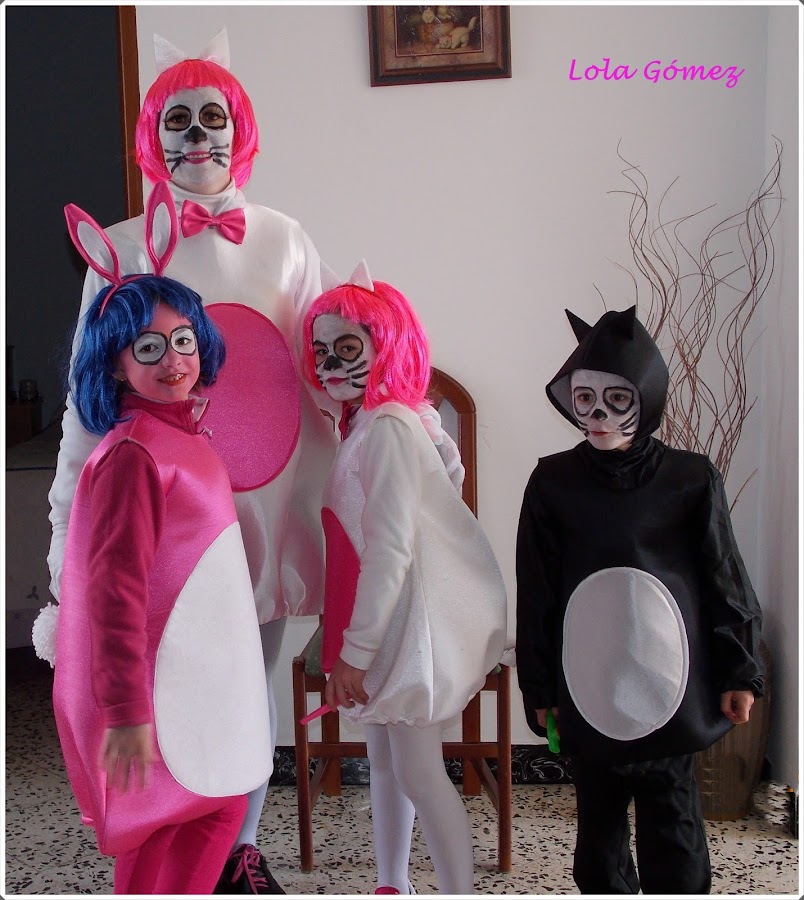 Aquí con otro Pou-conejita, la amiga Marta. Los disfraces están hecho con tela acolchada de carnaval, y bueno muuucha imaginación para el resto de los complementos.