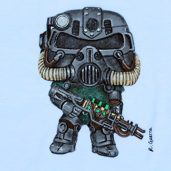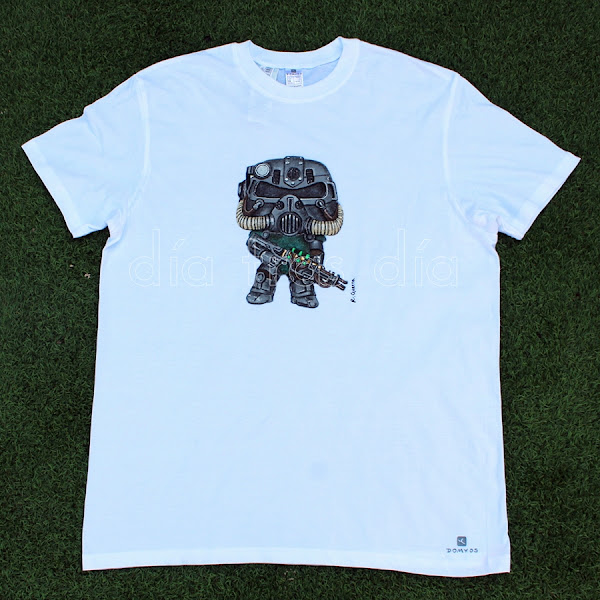 En realidad no he llegado a saber muy bien quién es el personaje que tenía que hacer en la camiseta. Creo que se trata de un personaje de un videojuego, pero no me echéis demasiada cuenta. Según he sabido, es un Power Armor. Si conocéis quién es este personaje, contádmelo, please ;-)