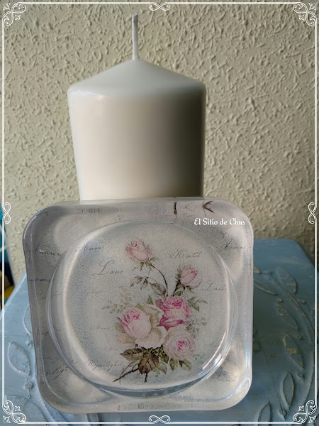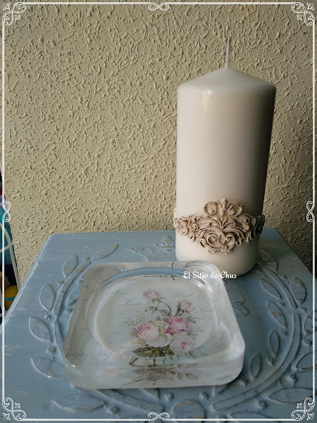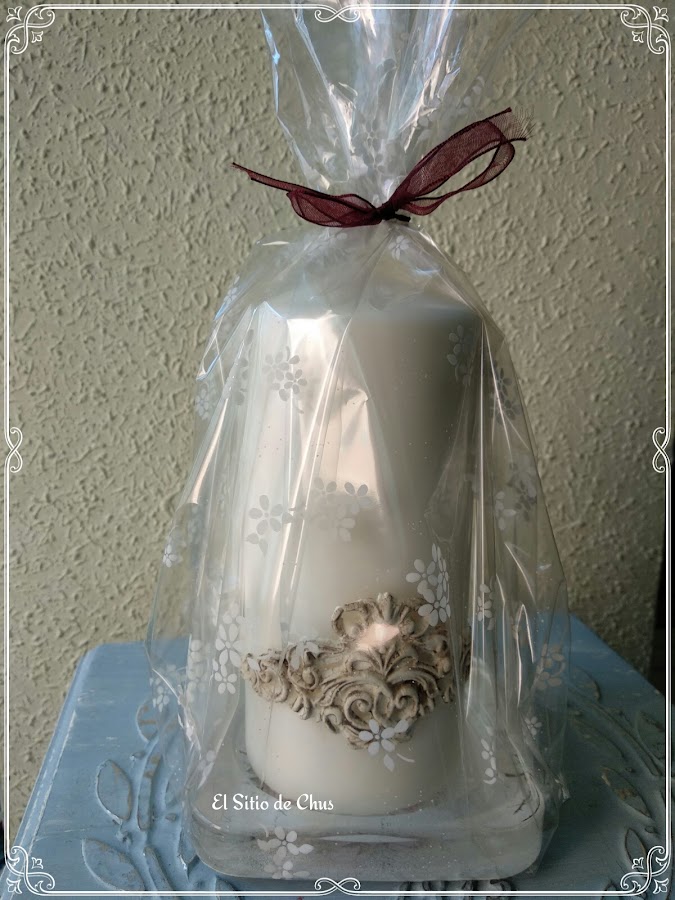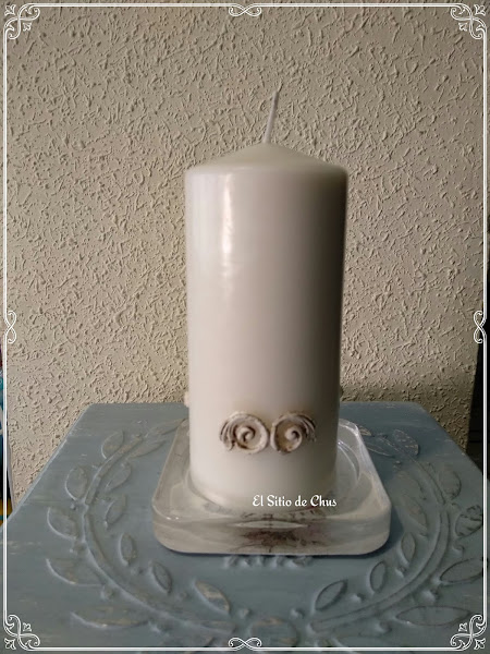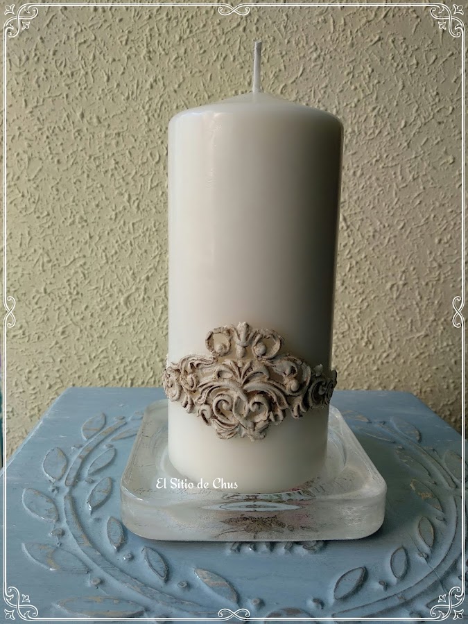 En una vela adquirida en Ikea, pegué dos moldes realizados con pasta de papel, el grande para la parte delantera y el pequeño para detrás.
