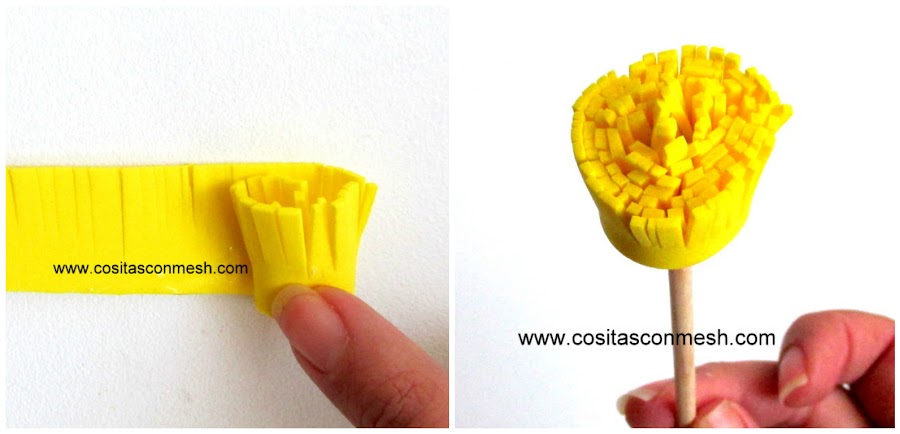 Cortar una tira de 2.5 cm x 12cm de largo en goma eva amarillo, con unas tijeras cortamos finamente esa tira dejando la base sin cortar (checa la foto)