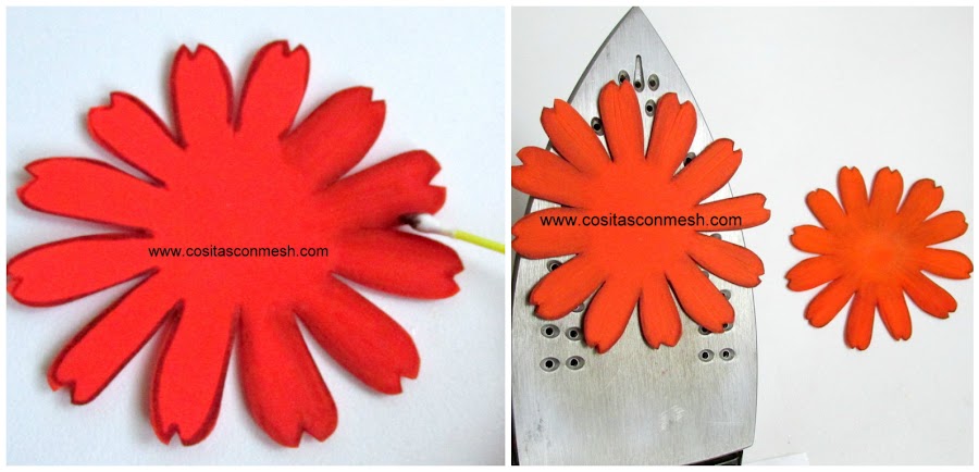 2.-Cortamos los moldes de la flor en foami naranja, usare unas tijeritas delgadas para facilitar el corte, luego cortare piquitos triangulares en la puntita de cada pétalo (checa la foto).