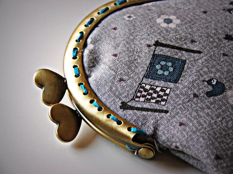 Sew the edge of the purse leaving an opening on the bottom, where the clasp is going to be placed, for turning (pic HERE). Turn the purse right side out and put the clasp in its place. Now sew with the thread that you"ve chosen (pic HERE).