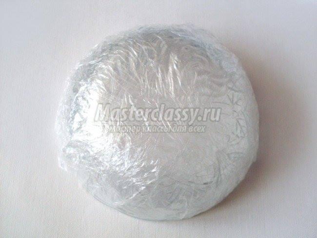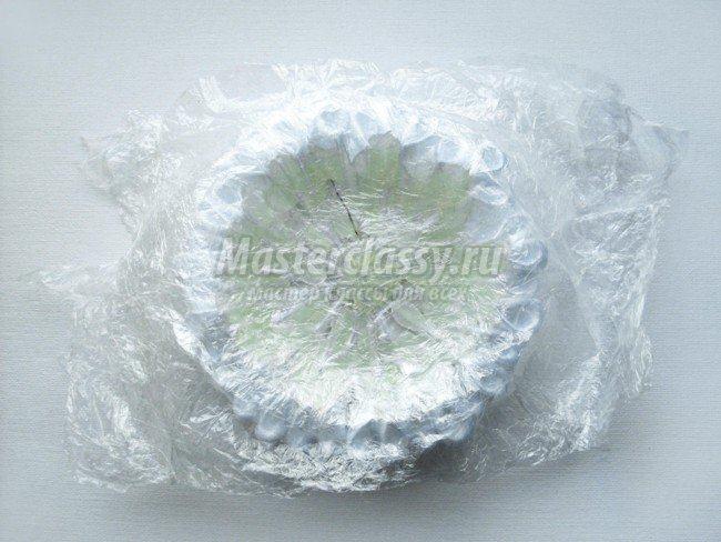 Un recipiente redondo envolvemos con el plástico que se usa en la cocina para tapar los alimentos. Pegamos primero el centro de 10 pétalos y luego uno por uno añadimos pegando con la silicona caliente los demás pétalos.