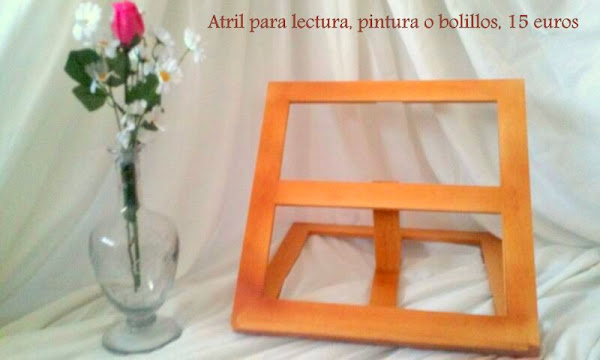 Para las mañosas o mañosos, que empiezan emerger los hombres también en el mundo del bolillo, aquí os presento éstos mundillos, tanto para los que empezáis, como para los de "modo experto". Hechos con mucho amor y mimo, por un carpintero y artesano alcalareño llamado Fernado. Los envía a domicilio, pero también podéis recogerlos en su casa, en Alcalá de Guadaíra. Yo tengo uno y os puedo decir que no les falta detalle, y que los acabados son impresionantes. Las tortas, son de unos 50 centímetros, pero si los queréis personalizados, sólo es llamar y hablarlo con él, porque se adapta a vuestros gustos. Los atriles, vienen bien para las tortas, pero también para lectura, pintura, manualidades, y lo que se os ocurra.