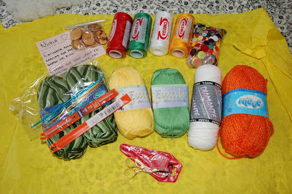 Tenía ganas de ver esos estambres de Méjico, que a veces veo en vídeos o en blogs latinoamericanos. El lote es completísimo: 4 ovillos de nylon, 4 ovillos de algodón mercerizado, 1 de Diamante blanco y otro acrílico naranja. Unas tijeras pequeñitas preciosas, que creo que a partir de ahora no se separarán de mí. Varios ganchillos y miles de botones, sí, un montón de botones que han hecho feliz a mi hija, jaja, ya ha estado ordenándolos por colores y tamaños....