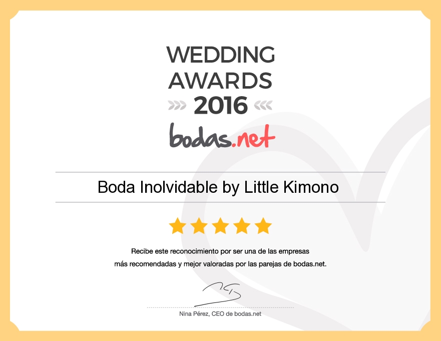 Boda Inolvidable by Little Kimono de Burgos ha recibido uno de los galardones Wedding Awards 2016 de la categoría Detalles de Boda otorgado anualmente por bodas.net, con el objetivo de reconocer la labor realizada por los proveedores del sector nupcial en nuestro país.