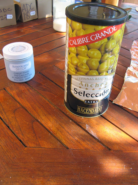El bote de aceitunas decorado lo vá a utilizar para poner los folios (eso lo he decidido yo)....no sé vuestros hijos adolescentes, pero este mío utiliza toneladas de folios....para resúmenes, para trabajos, los que tira porque se equivoca....en fin......una locura...