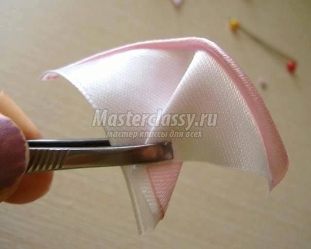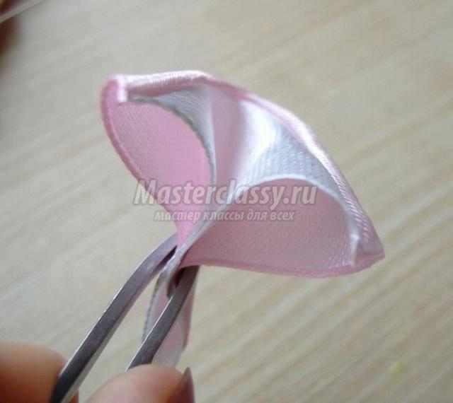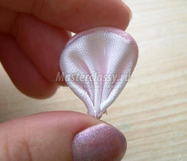Luego aplanamos el cuadrado resultante y lo usamos para hacer el pétalo redondo Kanzashi (con el lado brillante hacia afuera).