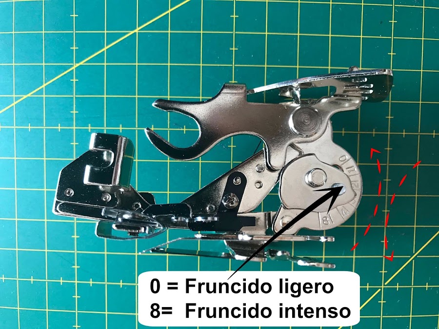 Con este prensatelas lo que tenemos que regular es la presión de la máquina, para hacer un fruncido más o menos intenso. En mi caso la tensión que me da un buen resultado es la 9 (la máxima en mi máquina) y la puntada más larga 4 (en mi caso).