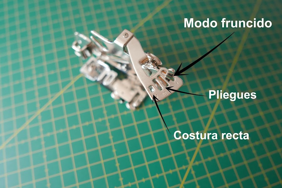 El tercer prensatelas para fruncido es el conocido como ruffler; sin duda es el más completo, ya que nos permite además de fruncir, plisar, y no sólo un tipo de pliegues. Y además también podemos unir varias telas en la misma costura. Sin duda no se puede pedir más, pero también es el que más cuesta entender.