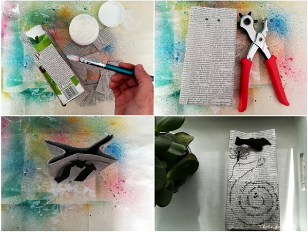 Una vez el tetrabrik limpio, lo forras con papel de periódico. Cuando se ha secado, le haces unos agujeros en la parte superior y pasas un lacito.