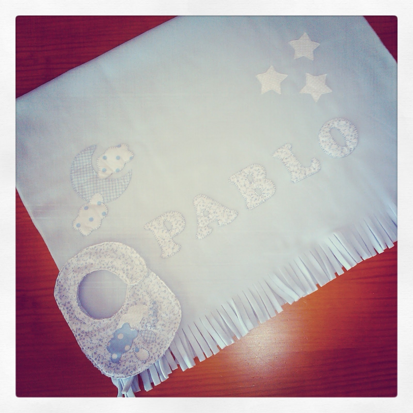 Hoy os traigo un conjunto de manta y babero, hay que ir preparando a los más pequeños para el invierno. Y que mejor que una manta con unos detalles con tela y el babero a conjunto.