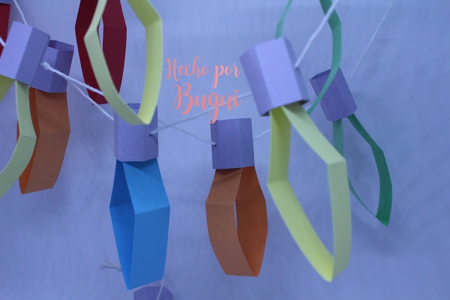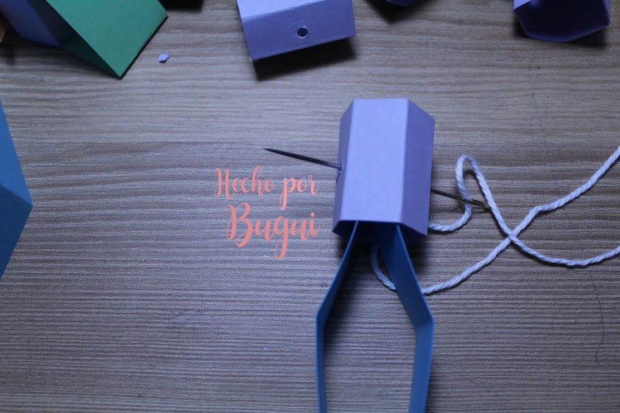* Enhebra la aguja con un hilo tan largo como desees; pasa la primera bombilla, deja 20 cm y haz un nudo. Este trozo es el que te servirá para sujetarlo a la pared, ventana...