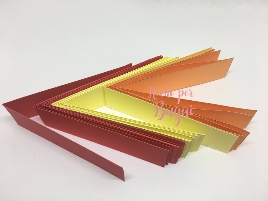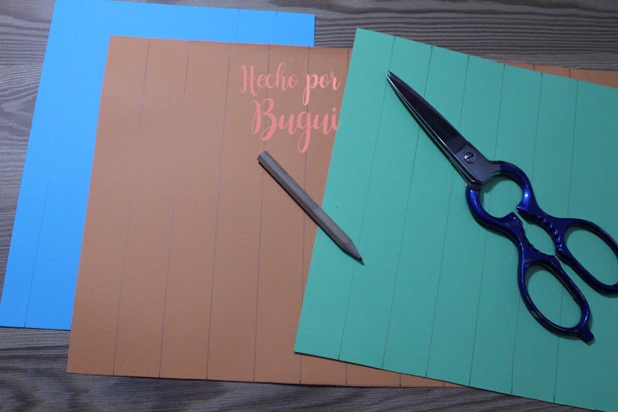 Marca lineas, en las cartulinas de colores, de 21cm por 2,5cm, y después recorta.