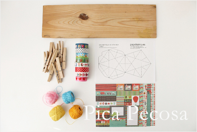- Un trozo de madera. Lo suficientemente grande para que quepan las 24 pinzas. El mío lo reciclé de una caja de fruta y lo pinté de blanco para que destacasen más los washi tapes.