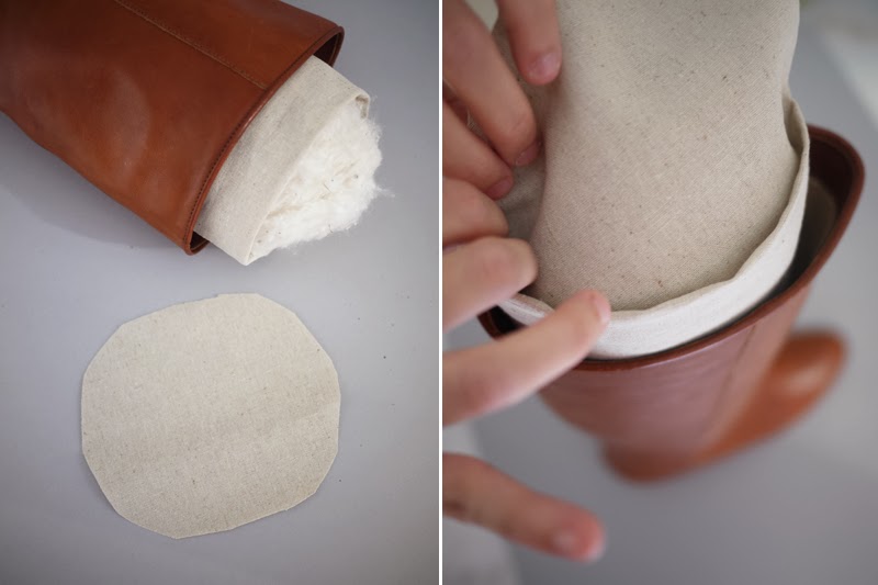 Se coloca dentro de la bota y se corta la tela sobrante, dejando unos 4 cm. Después se hace un dobladillo en el borde del tubo de tela.