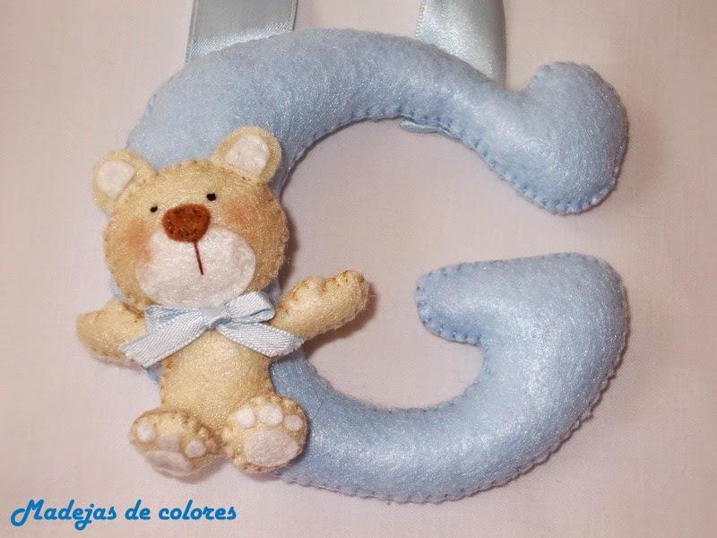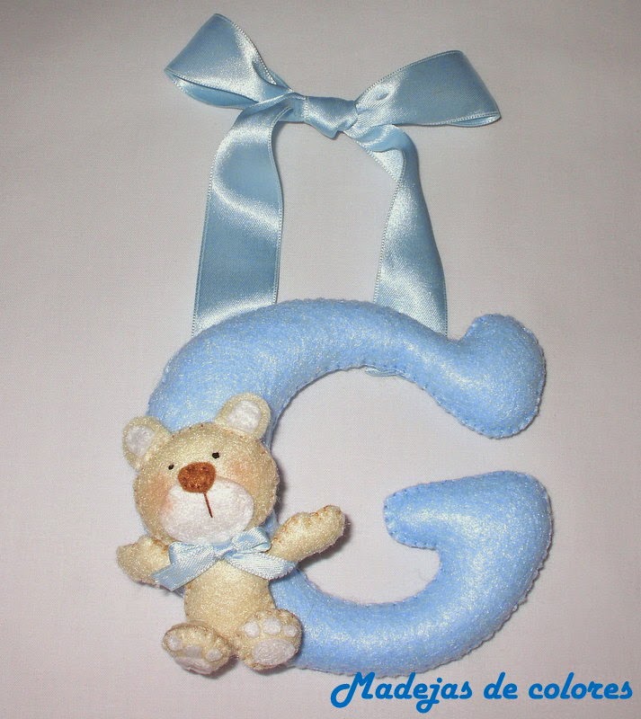 He hecho su inicial con fieltro, adornado de un osito en el mismo material.
