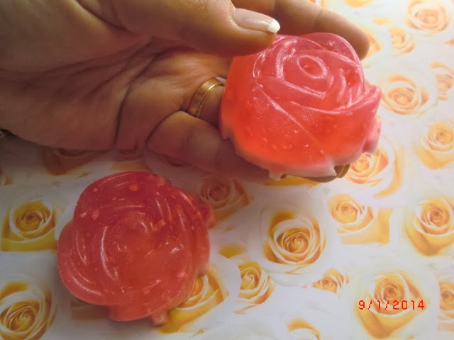 Combiné virutas del jabón de aceite con rosa mosqueta BIO que tuvo tanto éxito y lo mezclé con la glicerina y tal como imaginé, el color se va extendiendo y han quedado unos corazones y unas rosas con un color rosa delicioso!