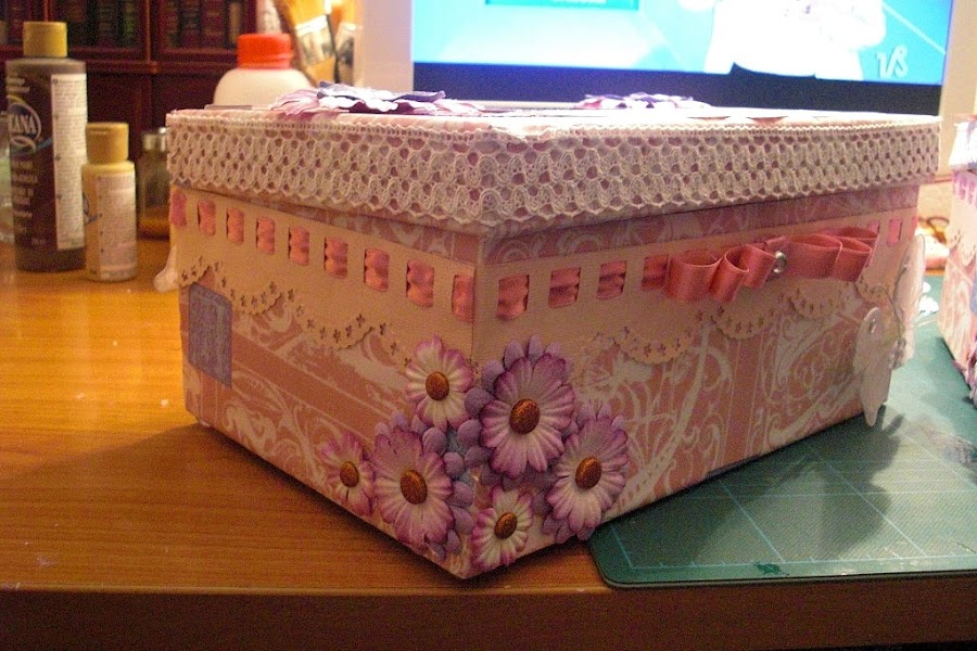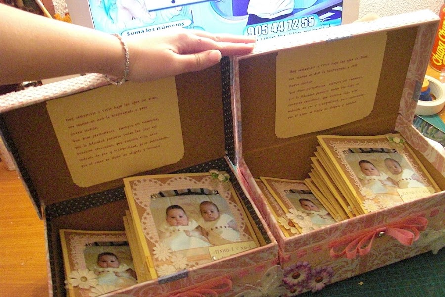 Pero una vez que ya llevaba más de la mitad de los recordatorios realizados, surgió una duda: ¿Cómo o dónde llevarán las madrinas las tarjetas para poderlas repartir? De ahí la creación de las cajitas pequeñas para que cada madrina pudiera llevar la caja personalizada de su ahijada.