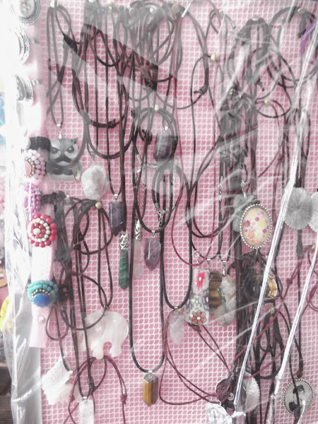Y aquí una gran variedad de colgantes, anillos, pendientes, broches... también hechos a mano. No se ven muy bien, ya que el tablón está forrado de plástico transparente para poder transportarlo mejor.