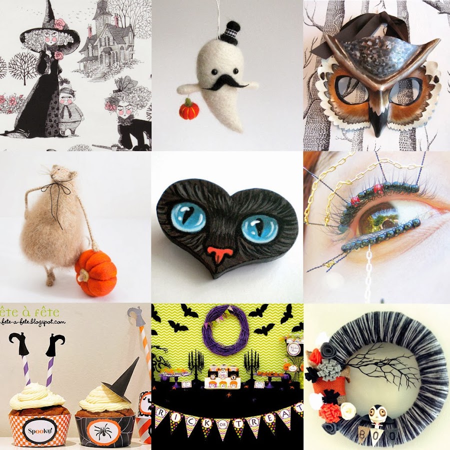 [Top row left to right] 1. I love the witches illustrations of the beautiful fabric by A2Freshprints. 2. Cute felted mustache ghost Halloween ornament, by fuzzonme. 3. The perfect complement for Halloween custom a horned owl leather mask, by SundriesAndPlunder. 4. A so lovely harvest rat for decorate your home, by Candyfleece. 5. For cat lovers a hand painted cat eye brooch, by ShebboDesign. 6. Spider false eyelashes for the Halloween night by EyelashJewelry. 7 and 8. Celebrate your Halloween party with these creative printable decorations, by FeteUS and LillianHopeDesigns. 9. In every celebrations there is always a precious wreath decorating doors, such as this by CreativeHandsBoston.