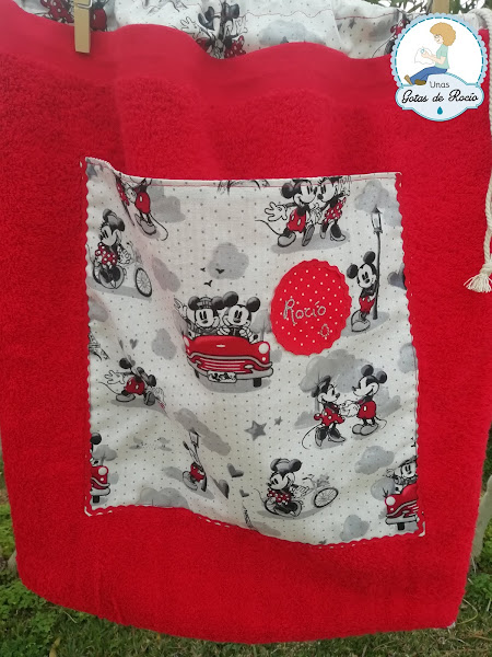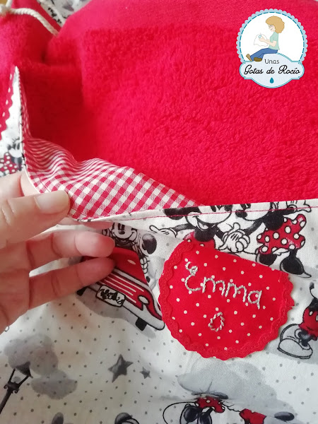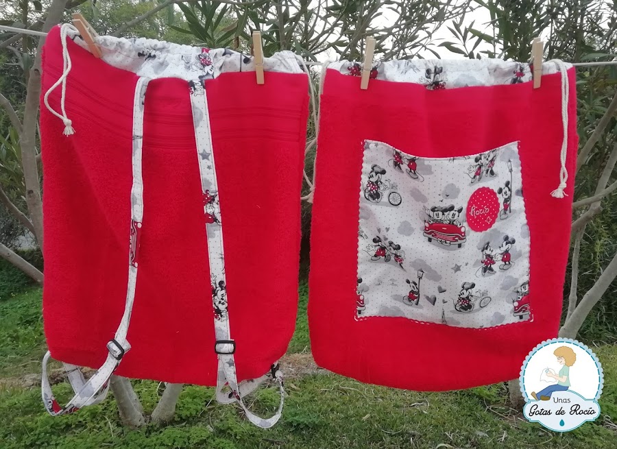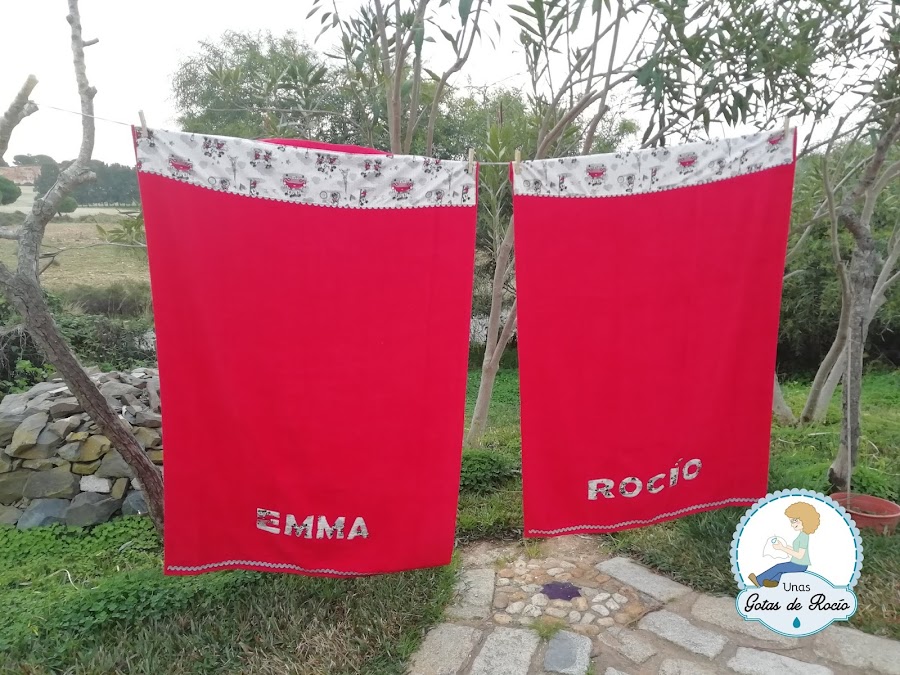 Las mochilas están hechas con las toallas de lavabo, forradas con vichy en rojo, un gran bolsillo exterior con el nombre bordado sobre tela roja con lunaritos blancos, asas regulables y bolsillo pequeño en el interior.