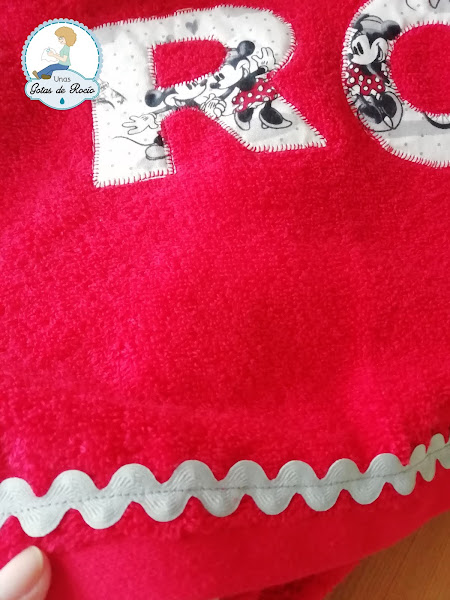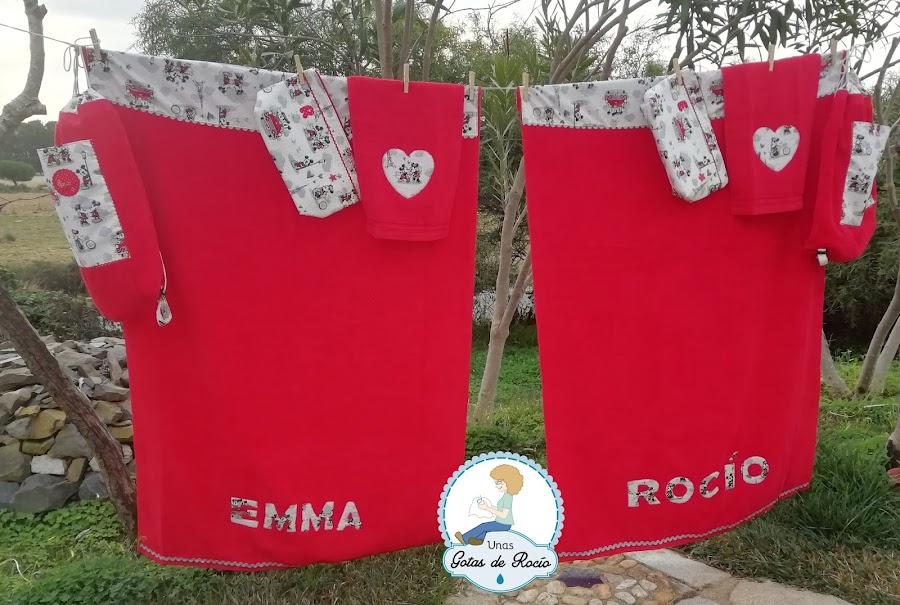 El conjunto lo compone una toalla de baño (que no de ducha), una mochila, un neceser y una pequeña toalla. Como podemos ver, las toallas llevan destacado el nombre de las niñas, así como una franja decorativa con la misma tela.